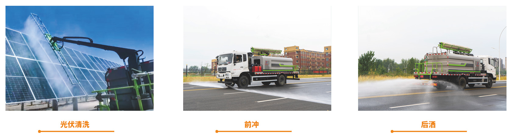 清掃系統(tǒng)包含噴水支架及滾刷,高壓噴嘴噴出高壓力、小流量的水流,配合掃刷的滾動能將太陽能光伏板的風(fēng)沙塵土污漬清洗干凈。