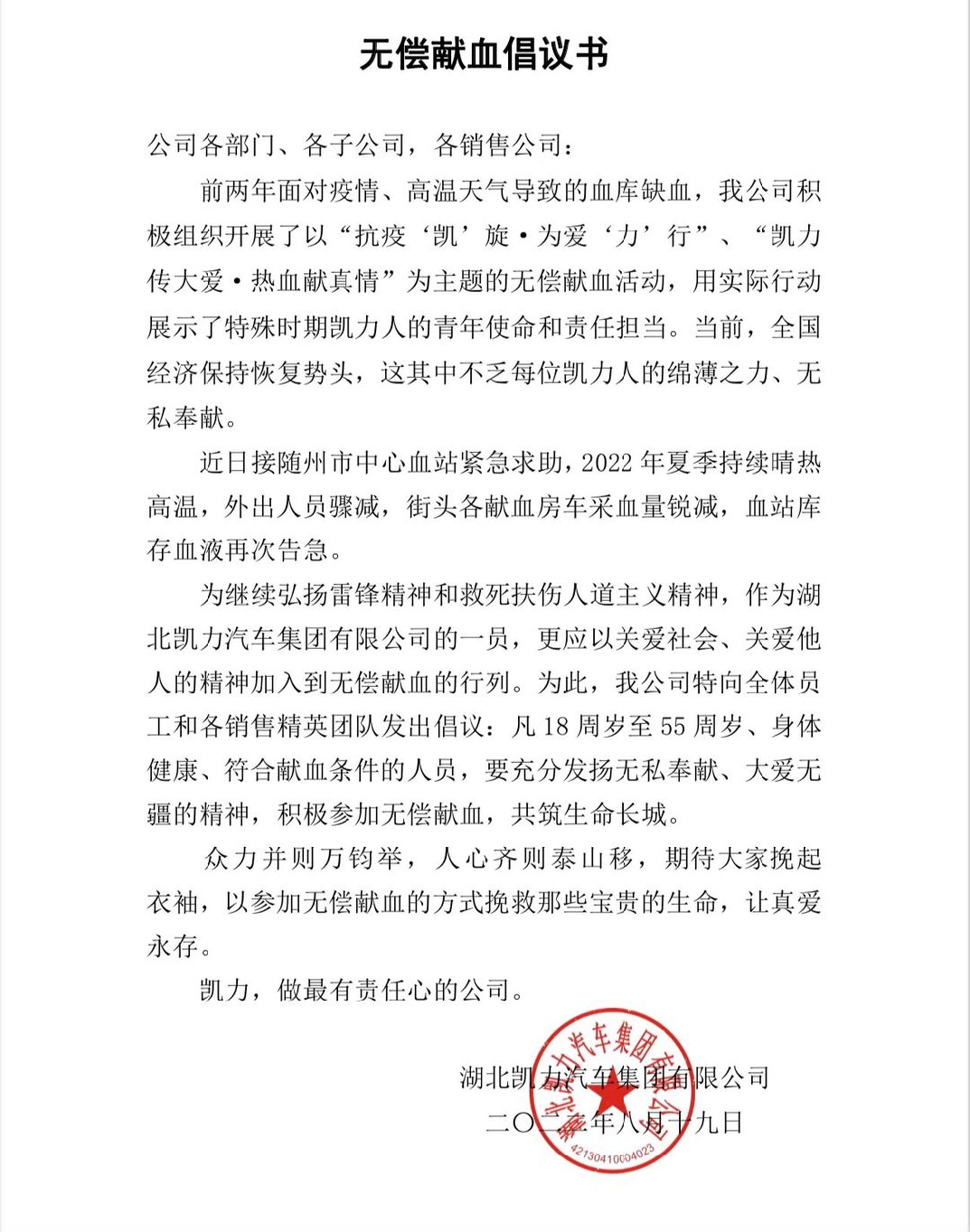 以熱血凝聚愛心,用行動詮釋奉獻(xiàn),為保障常態(tài)化疫情防控及高溫期間全市醫(yī)療用血供應(yīng),滿足醫(yī)療需求,為隨州市人民群眾生命安全和身體健康奉獻(xiàn)專汽人的一片愛心。8月24日凱力汽車集團(tuán)積極響應(yīng),開展以“凱力傳大愛·熱血獻(xiàn)真情”為主題的無償獻(xiàn)血公益活動,為隨州市頻頻告急的血庫增添了寶貴的血源。