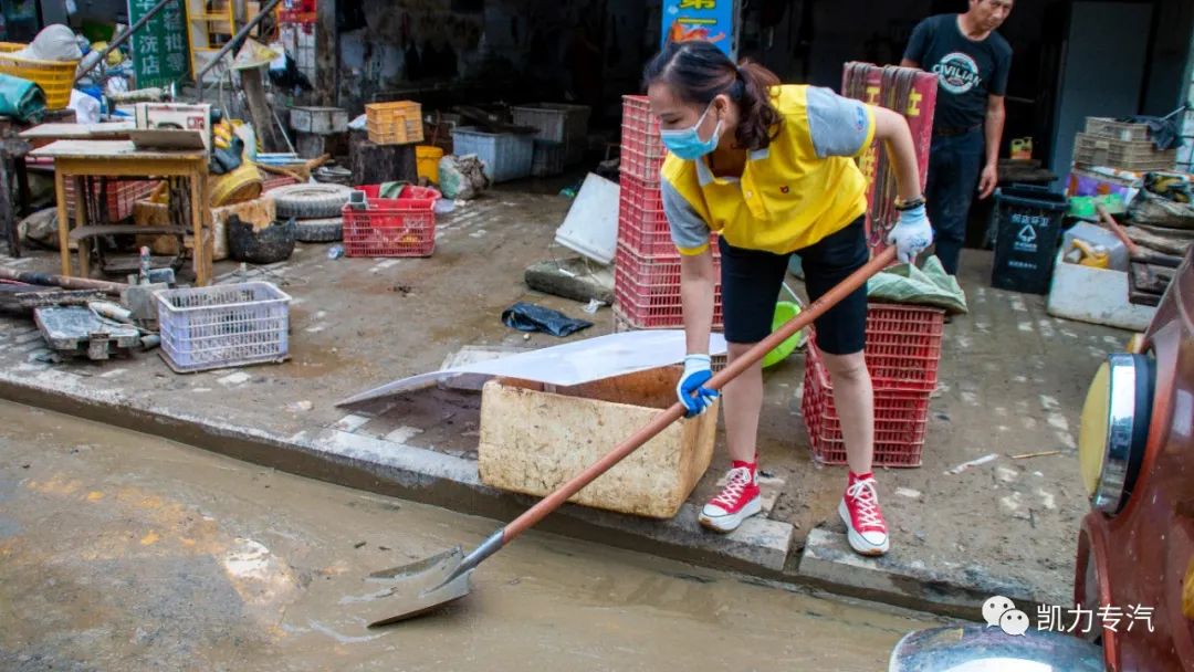 在何店鎮(zhèn)災(zāi)區(qū)現(xiàn)場,隨處可見灰黃色的靚麗身影,凱力人不畏艱難,不辭辛苦,踏著泥濘,揮灑汗水,用鐵鍬一把把鏟起因暴雨洪水沖刷而產(chǎn)生的泥沙和雜物,熱情主動的幫助災(zāi)民清洗生活用品、清理街道雜物。派出的應(yīng)急救援車輛采用機(jī)械化交替作業(yè)模式,抽、吸、掃、沖、洗、噴各種功能盡顯環(huán)衛(wèi)保潔身手,大大提高災(zāi)后重建工作效率。人機(jī)不停,連續(xù)數(shù)小時投入救援工作,快速恢復(fù)道路環(huán)境秩序。凱力人用堅定的步伐和滿身的汗水溫暖著災(zāi)區(qū)人民,用實際行動和無私奉獻(xiàn)踐行著凱力人的責(zé)任與擔(dān)當(dāng)。