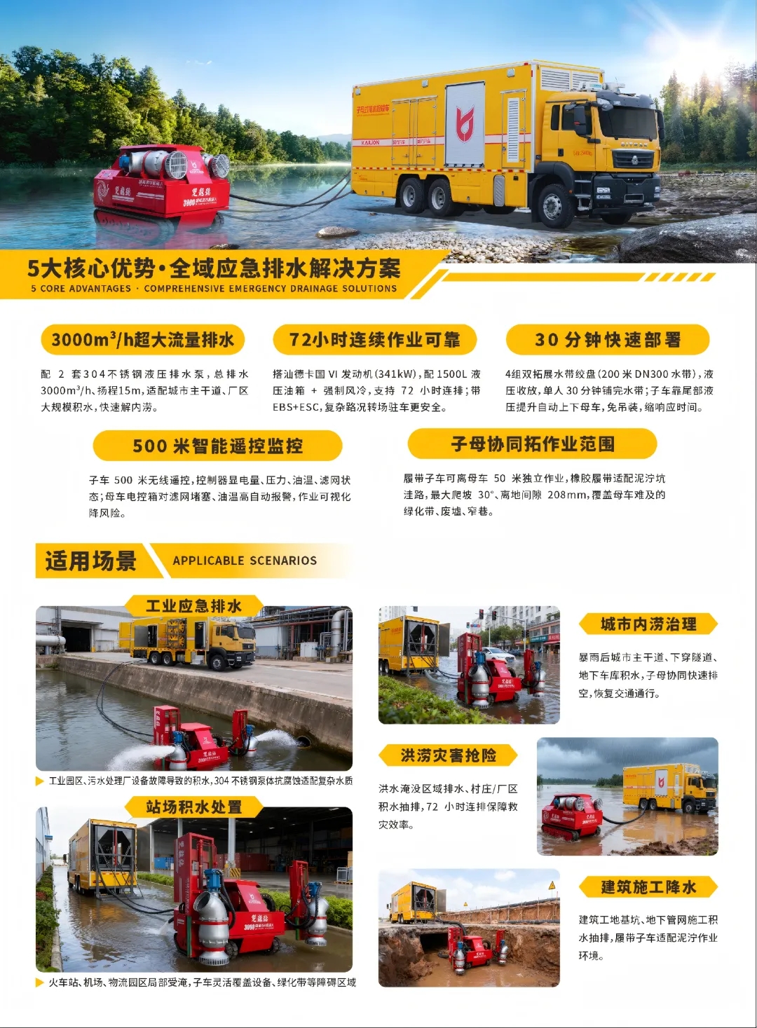 配備小型履帶子車,從車廂尾部提升機(jī)構(gòu)上下主車,采用油管供油,為車輛提供動(dòng)力,可遠(yuǎn)離母車50米,支持500米無線遙控,配備兩臺(tái)大流量排水泵,可0-90度翻轉(zhuǎn),可單獨(dú)也可同時(shí)排水工作,配有掛鉤用于自救或其他牽引用途,具備爬30°陡坡能力。
