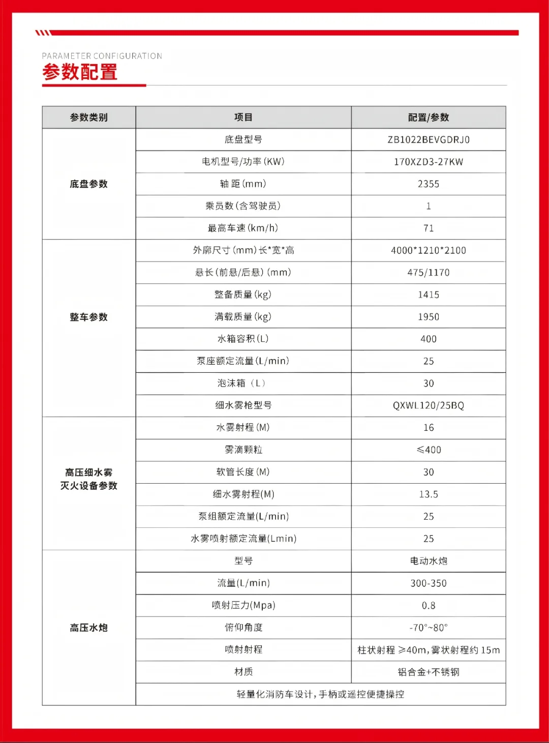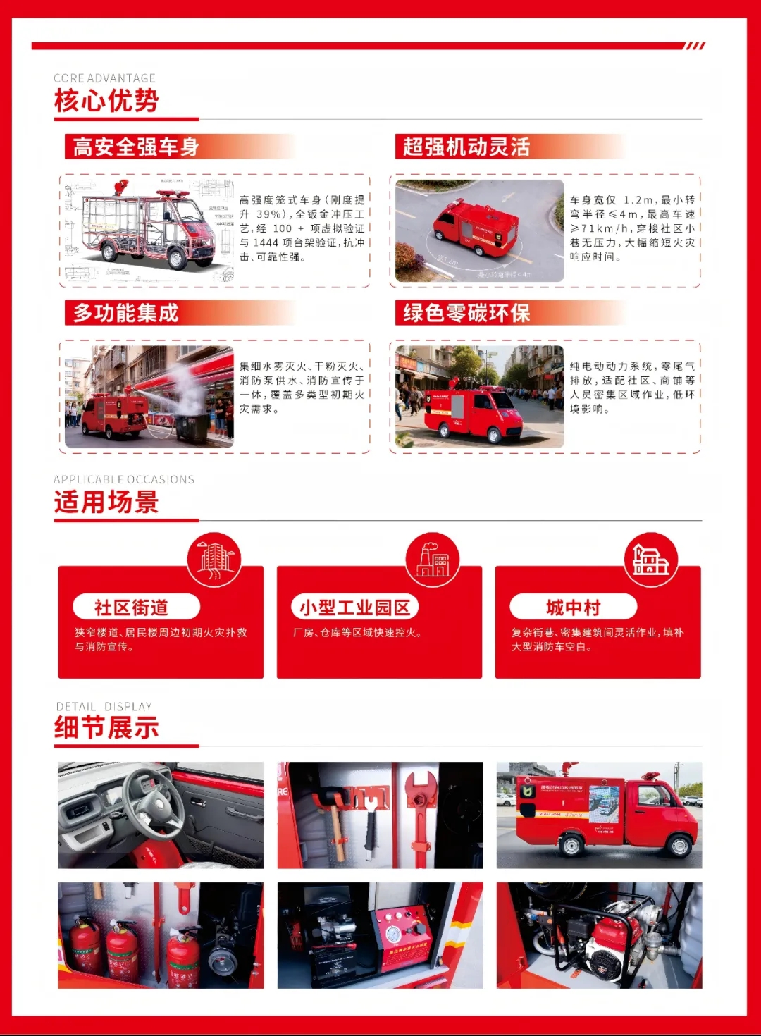 凱力風(fēng)牌大神童純電動(dòng)多功能消防車,是一款輕量化消防裝備,機(jī)動(dòng)靈活、功能高效,是社區(qū)街道、小型工業(yè)園區(qū)及狹窄區(qū)域消防巡邏、日常消防宣傳與初期火災(zāi)撲救的理想選擇。