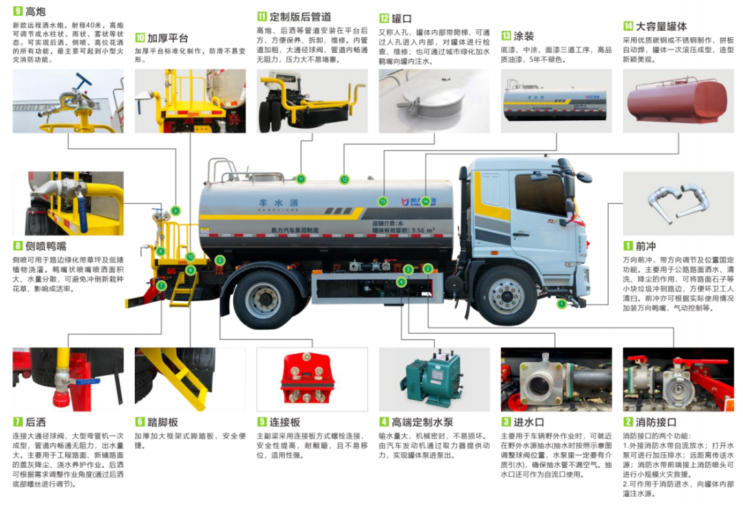 產(chǎn)品標(biāo)配前沖、后灑、側(cè)噴、后置式工作平臺、平臺上有高壓水炮(可360°旋轉(zhuǎn),水霧形狀可調(diào)成直沖狀、 大雨、 中雨、 小雨、毛毛雨;調(diào)成直沖狀最大射程≧ 35 米,也可調(diào)成霧狀最大射程≧15 米)、配備優(yōu)質(zhì)大功率專用灑水泵,品牌取力器、雜物過濾網(wǎng)、國標(biāo)通用65型消防接口(可通過消防栓加水)、1 套自流球閥系統(tǒng)(可自吸自排,最大吸程 7 米)、2根引水鋼絲膠管。適用于各種路面清洗;樹木、綠化帶、草坪綠化;道路、廠礦企業(yè)施工建設(shè)、高空建筑沖洗。具有灑水、壓塵、高(低)位噴灑、農(nóng)藥噴灑、護欄沖洗、應(yīng)急消防等多種功能。